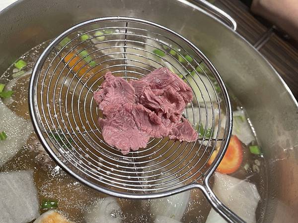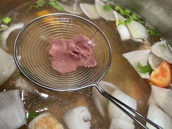 重點是,他突然把爐火關掉。說他們的牛肉,猛火容易煮太老,湯滾起後最好關火才來涮。