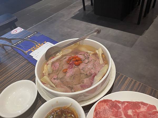 點了簡單的清湯鍋,可更突出肉的鮮味。上鍋時一個年輕人來熱情說明:他們的牛肉每天新鮮從牧場運到,新鮮的牛肉沒有注水,互相會黏著。